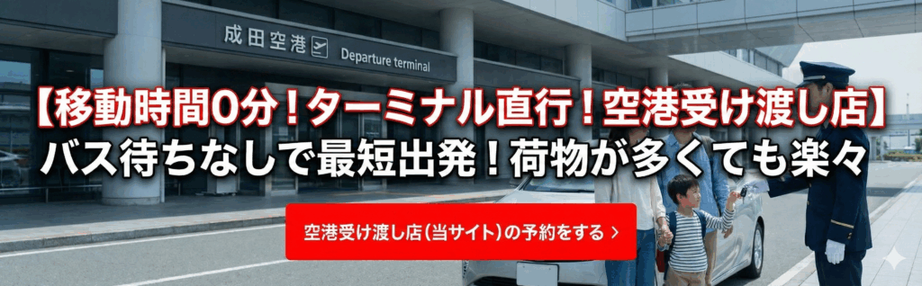 A. 最大の違いは「移動時間」と「手間」です。 一般的な「バス送迎タイプ」は駐車場に車を停めてからバスを待つ時間や荷物の積み下ろしが発生しますが、当店の「空港受け渡し」はお客様のお車を成田空港の乗降場でお預かりします。バス待ち時間ゼロ、重い荷物を持って移動する必要もありません。お急ぎの方や、小さなお子様連れ、お荷物の多い方に選ばれています。(第三ターミナル向け乗降場は第二ターミナルとなります)